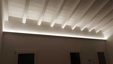 La linea da interno comprende elementi per creare tagli di luce nel soffitto o controsoffitto in cartongesso, gole luminose, segnapasso ad incasso, velette soffitto, corrimano con luce diffusa led, cornici luminose intorno alle porte e finestre ed altre applicazioni.