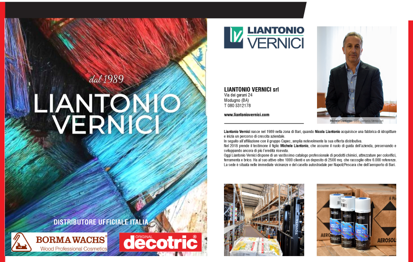 Oggi Liantonio Vernici dispone di un vastissimo catalogo professionale di prodotti chimici, attrezzature per colorifici, ferramenta e brico. Ha al suo attivo oltre 1000 clienti e un deposito di 2500 mq. che raccoglie oltre 6.000 referenze.