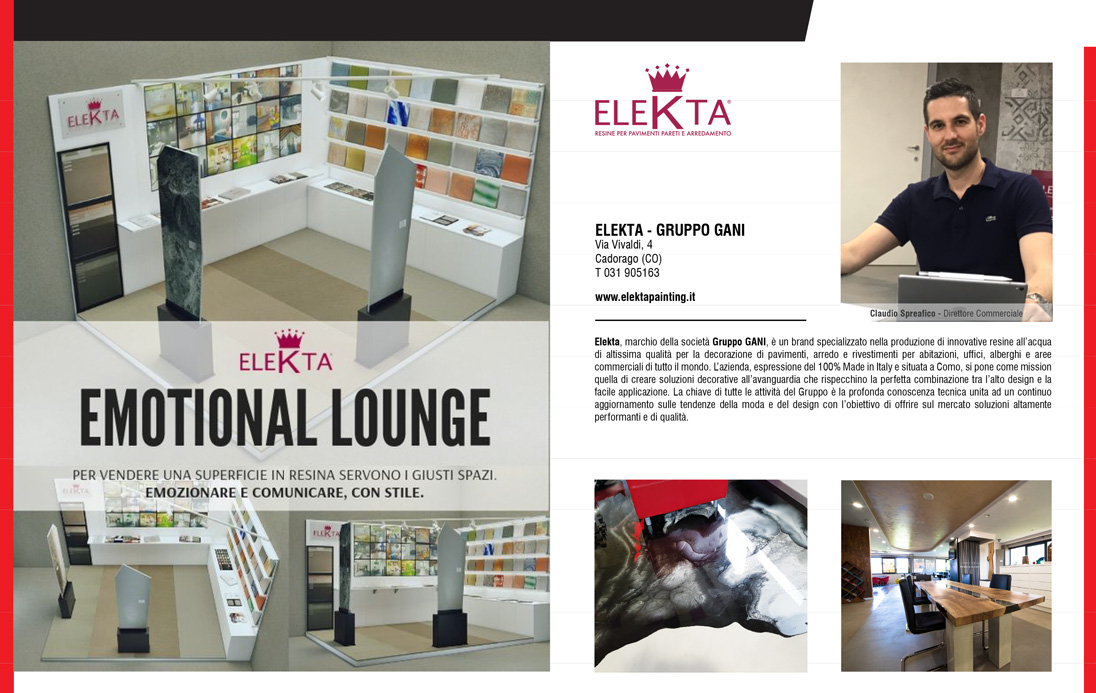 Elekta, marchio della società Gruppo GANI, è un brand specializzato nella produzione di innovative resine all’acqua di altissima qualità per la decorazione di pavimenti, arredo e rivestimenti per abitazioni, uffici, alberghi e aree commerciali di tutto il mondo. L’azienda, espressione del 100% Made in Italy e situata a Como, si pone come mission quella di creare soluzioni decorative all’avanguardia che rispecchino la perfetta combinazione tra l’alto design e la facile applicazione. La chiave di tutte le attività del Gruppo è la profonda conoscenza tecnica unita ad un continuo aggiornamento sulle tendenze della moda e del design con l’obiettivo di offrire sul mercato soluzioni altamente performanti e di qualità.