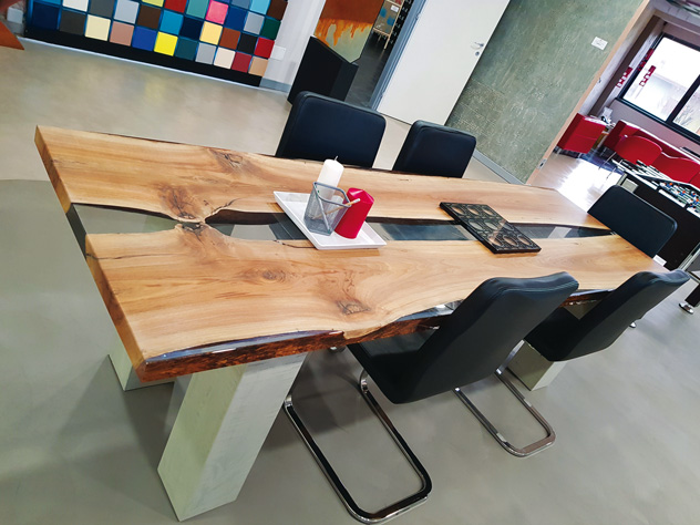 - Il Vetro Liquido, Una resina trasparente ad alto spessore per realizzare tavoli, mensole e altri manufatti in cui la trasparenza del vetro ingloba la solidità del legno o la durezza del metallo.