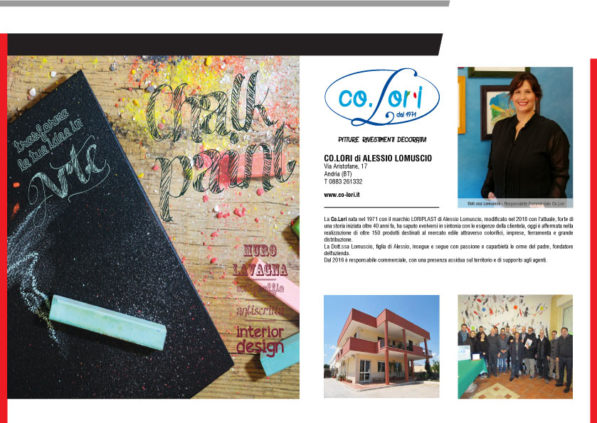 La Co.Lori nata nel 1971 con il marchio LORIPLAST di Alessio Lomuscio, modificato nel 2018 con l’attuale, forte di una storia iniziata oltre 40 anni fa, ha saputo evolversi in sintonia con le esigenze della clientela, oggi è affermata nella realizzazione di oltre 150 prodotti destinati al mercato edile attraverso colorifici, imprese, ferramenta e grande distribuzione.