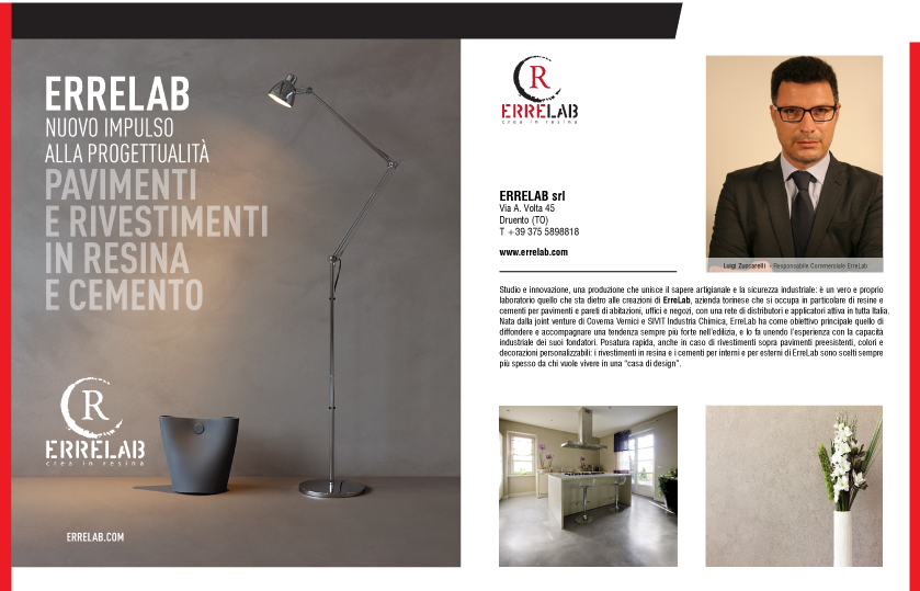 Nata dalla joint venture di Covema Vernici e SIVIT Industria Chimica, ErreLab ha come obiettivo principale quello di diffondere e accompagnare una tendenza sempre più forte nell’edilizia, e lo fa unendo l’esperienza con la capacità industriale dei suoi fondatori. Posatura rapida, anche in caso di rivestimenti sopra pavimenti preesistenti, colori e decorazioni personalizzabili: i rivestimenti in resina e i cementi per interni e per esterni di ErreLab sono scelti sempre più spesso da chi vuole vivere in una “casa di design”.