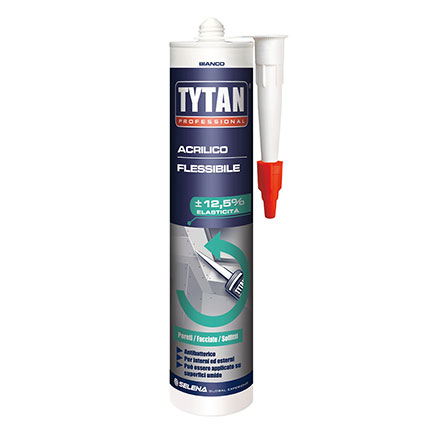 Tytan Professional ACRILICO FLESSIBILE è un sigillante acrilico professionale con eccellente qualità, adesione ed elasticità, non crepa e non si distacca con le normali sollecitazioni. È a base di lattice acrilico in dispersione acquosa che indurendosi crea una sigillatura con finitura satinata estremamente elastica ed uniforme. Per la connessione e sigillatura di materiali edili, posa e finitura di pareti in cartongesso, per giunti di dilatazione e sigillatura in interni ed esterni tra serramenti e muratura. Verniciabile anche con impregnanti per legno pigmentati.