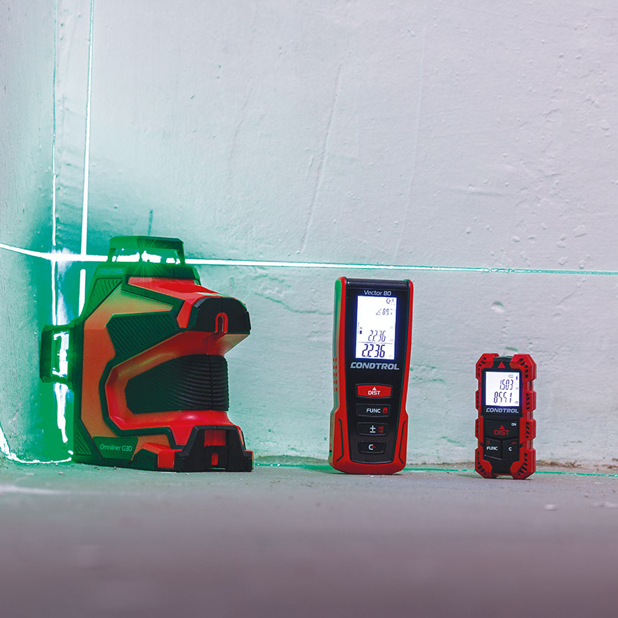 Omniliner G3D Green, livella laser a 360° per la posa in opera di pareti e controsoffittature in cartongesso, anche in spazio ampi. Posizione brevettate dei moduli laser per disegnare il profilo di partenza delle pareti e incastrarla negli angoli.