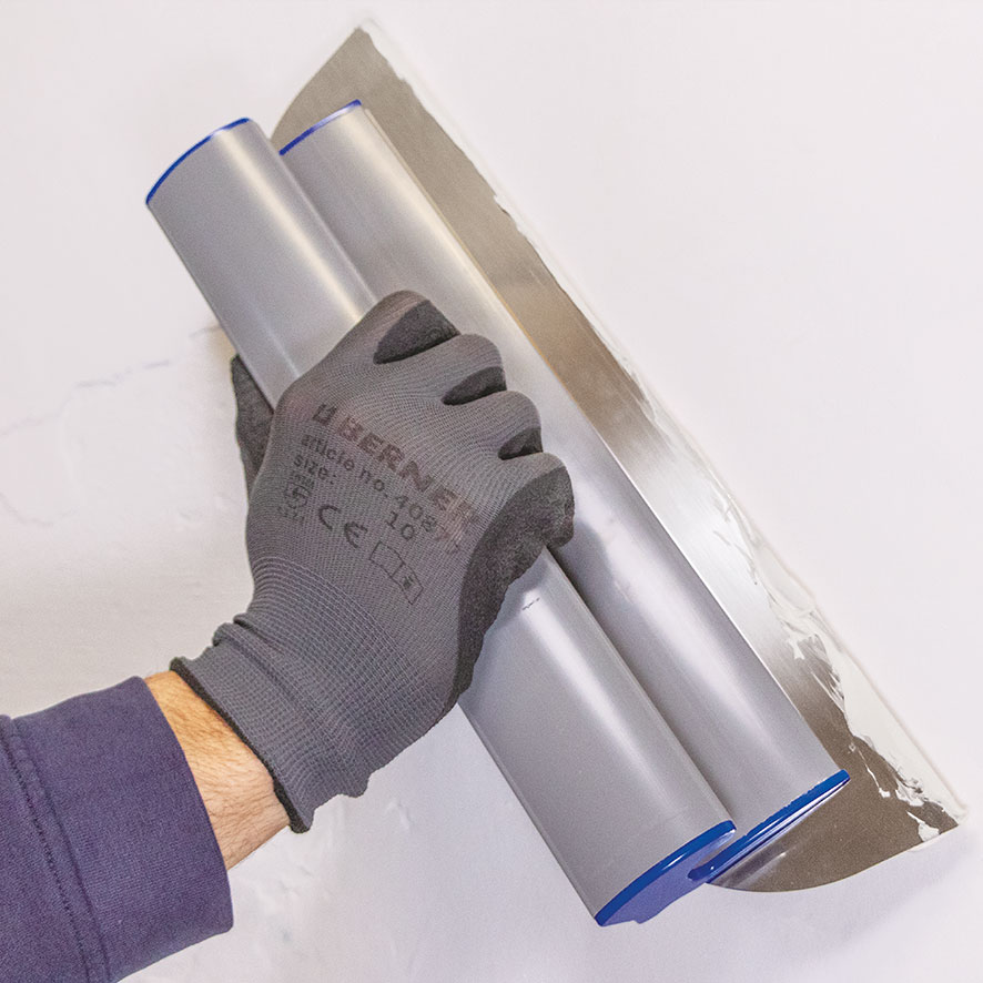Spatola Leios per stucchi, intonaci e decorativi. Lama inox flessibile da 0,3 mm con innovativo sistema di sostituzione. Impugnatura comoda, uso dritto/rovescio. In 6 misure. Accessori: lame di ricambio, aste telescopiche e kit in valigetta.
